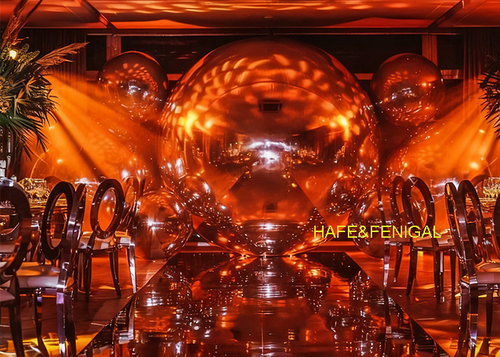 El rasgo distintivo de estos globos es su lujoso y brillante acabado de espejo, hecho de PVC reflector de primera calidad, que actúan como orbes gigantes y elegantes, rebotando la luz maravillosamente alrededor de la habitación.Esto crea un efecto caleidoscópico hipnotizante que eleva el ambiente, haciendo que los espacios se sientan más grandes, más brillantes y infinitamente más glamorosos.