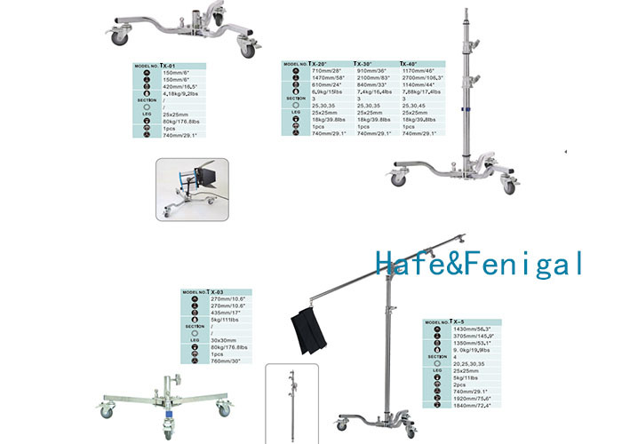 Estos soportes de luz de base rodante se utilizan ampliamente en estudios de cine y televisión donde las posiciones de iluminación necesitan un ajuste frecuente entre tomas.luces de fondo, y luminarias aéreas.