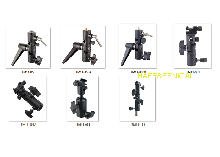 The series includes 5 models with tailored designs: TM11-050/TM11-050A feature a 7/8mm receptacle (standard for umbrella poles) and swivel mechanisms for angle adjustment; TM11-051A integrates a universal shoe mount for light fixtures; TM11-051/TM11-151 add adjustable shoe mounts to accommodate varied fixture sizes. Weights range from 0.18kg (compact models) to 0.37kg (sturdier swivel adapters), balancing portability and load-bearing capacity.